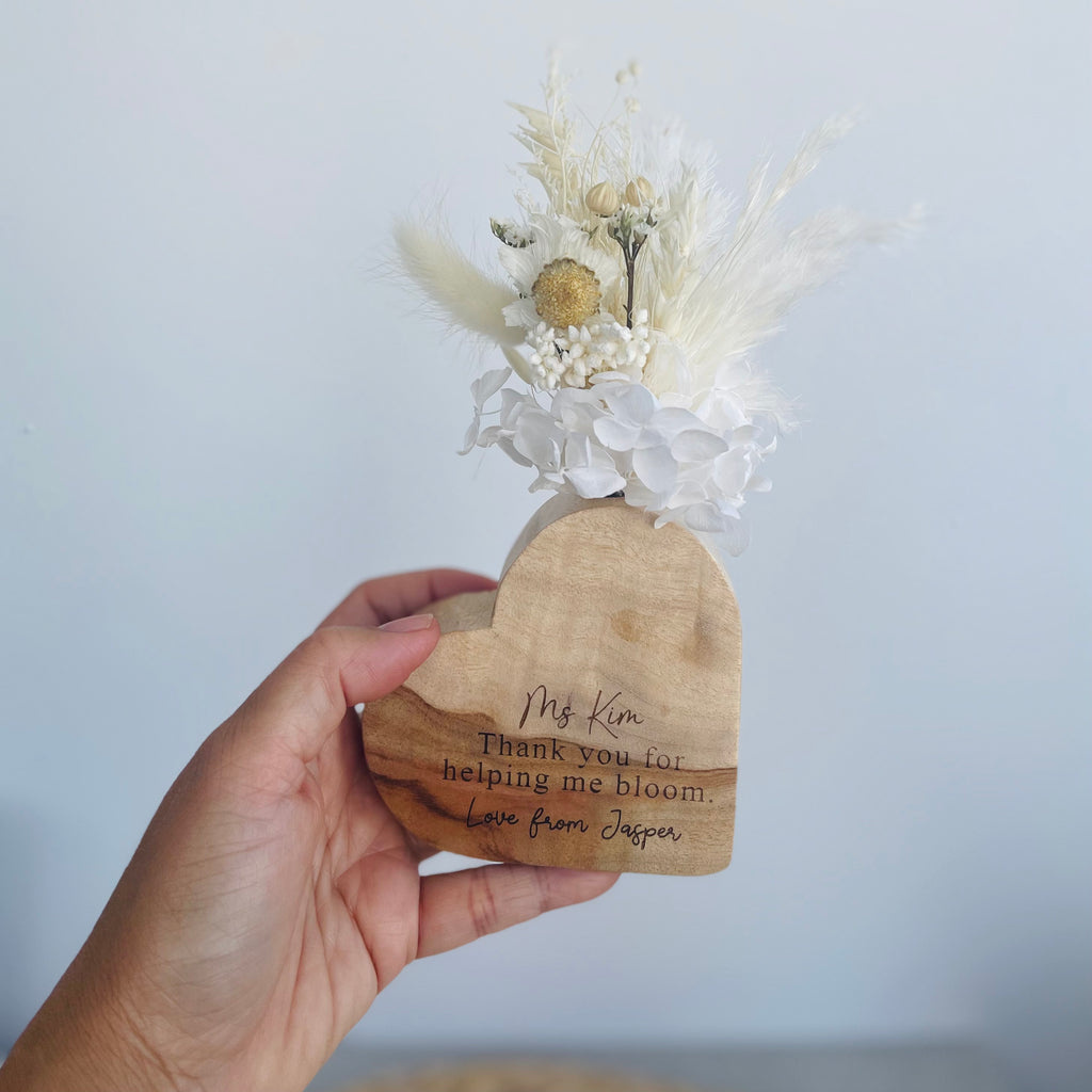 Personalised Teacher Gift Mini Heart Vase Custom | Wooden Keepsake with Dried Flowers