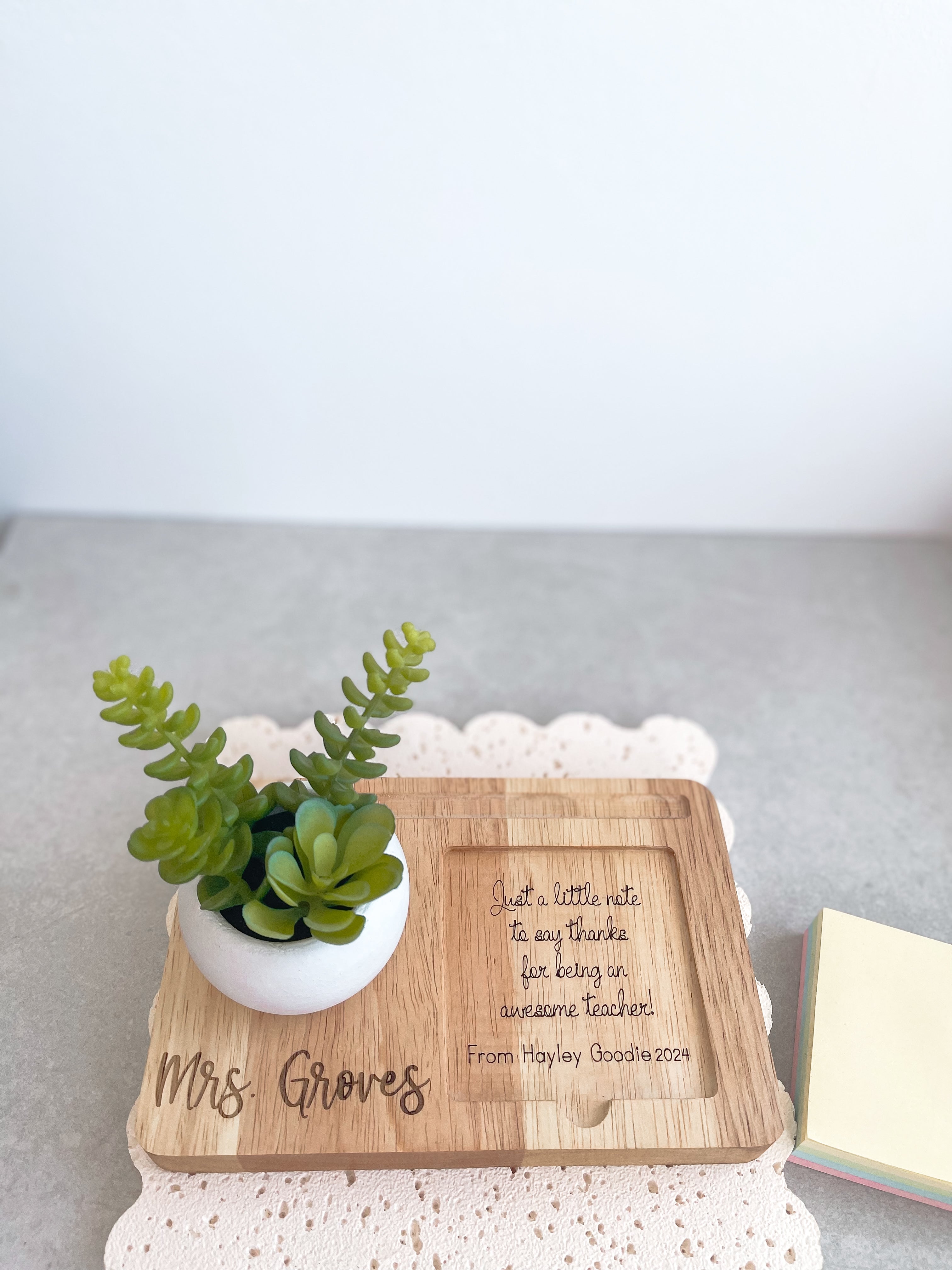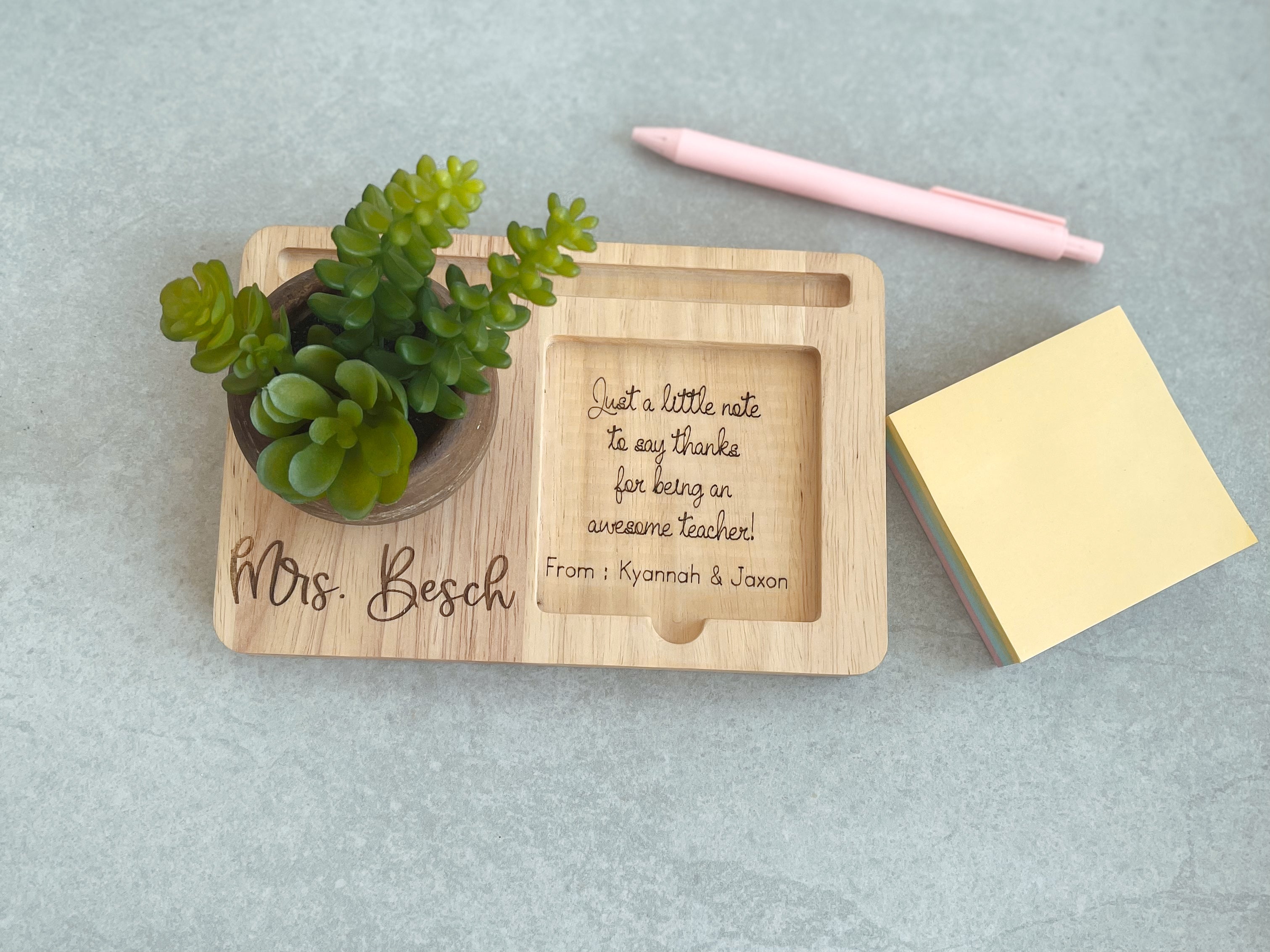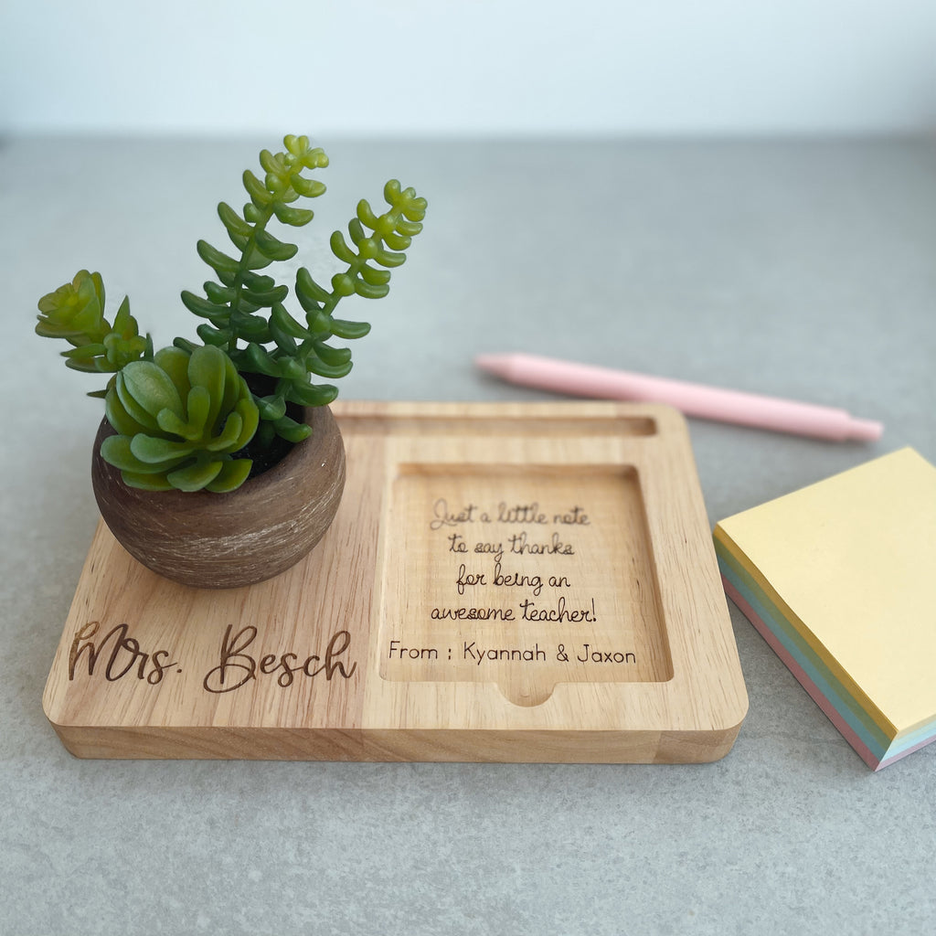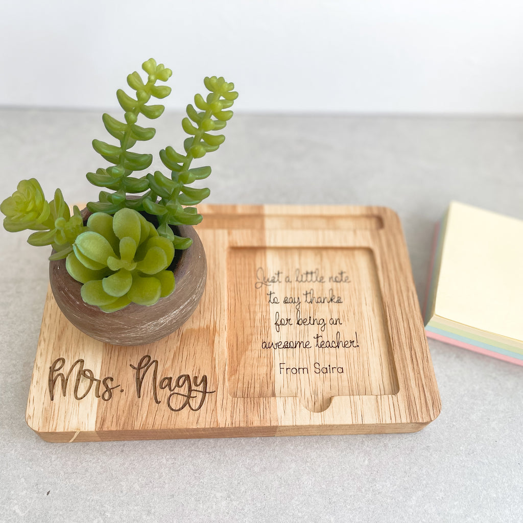 🎁Show your appreciation for your teachers with this beautifully crafted Personalised desk organizer. This wooden tray comes with a faux succulent in a rustic mini pot, a pen holder and a space for sticky note.