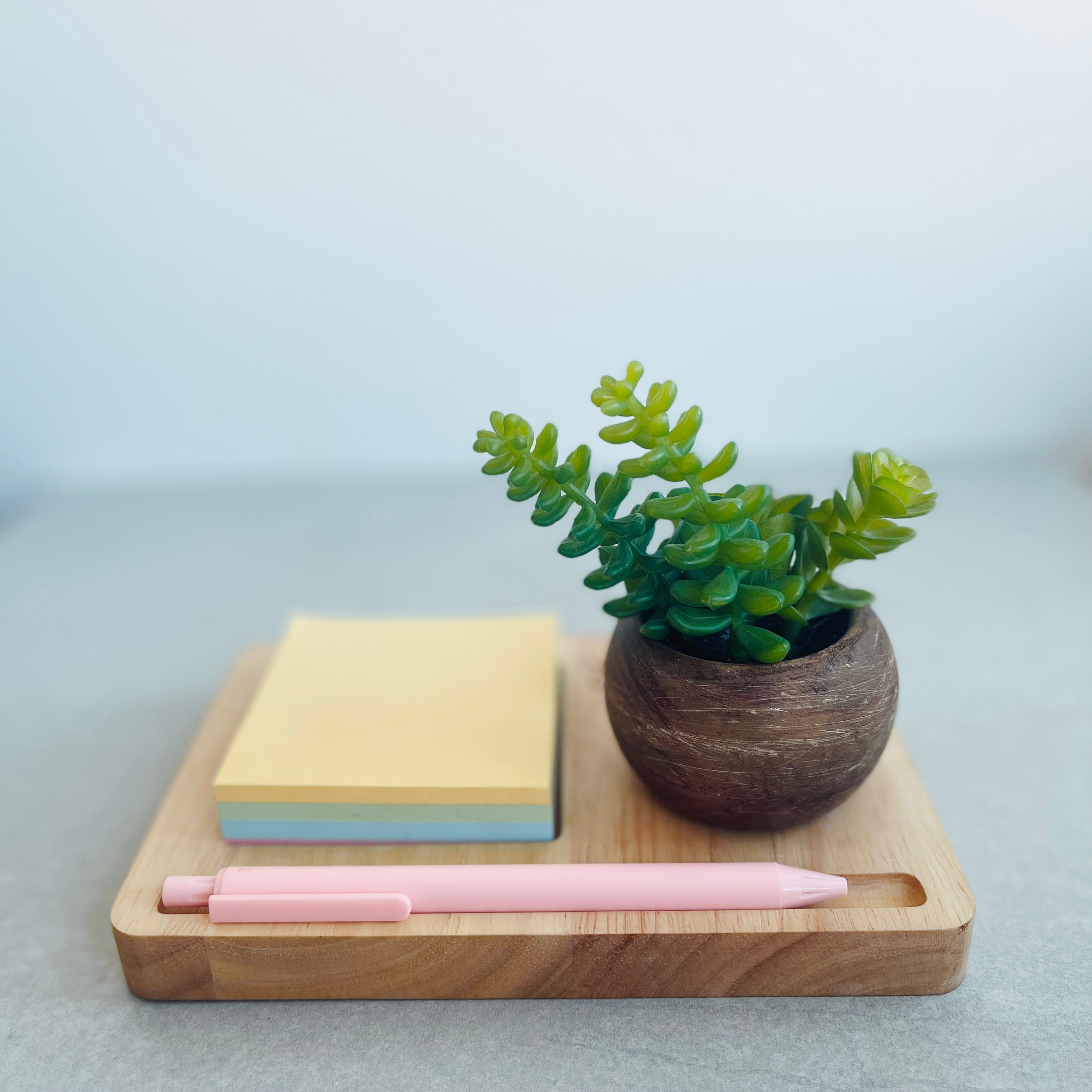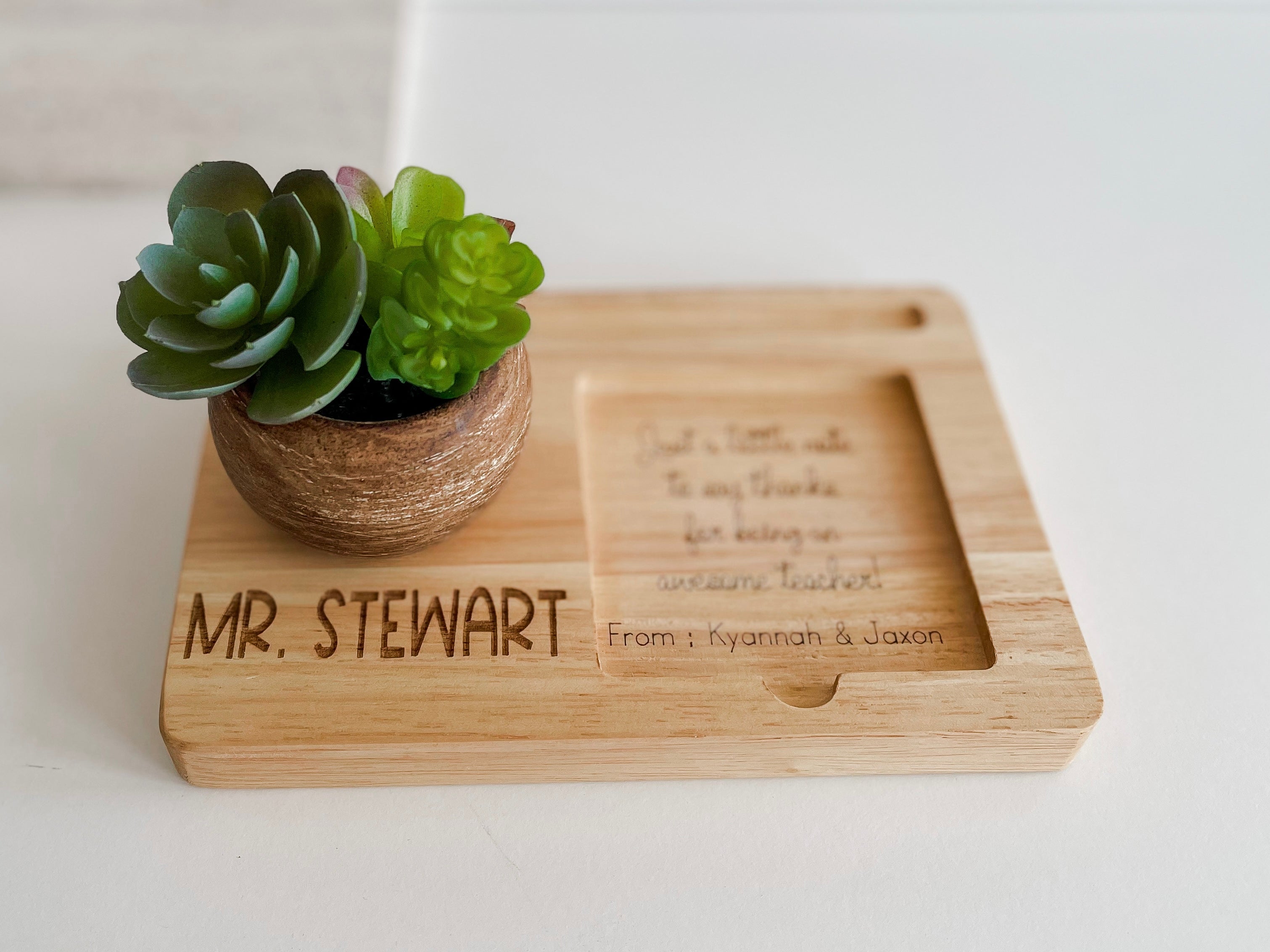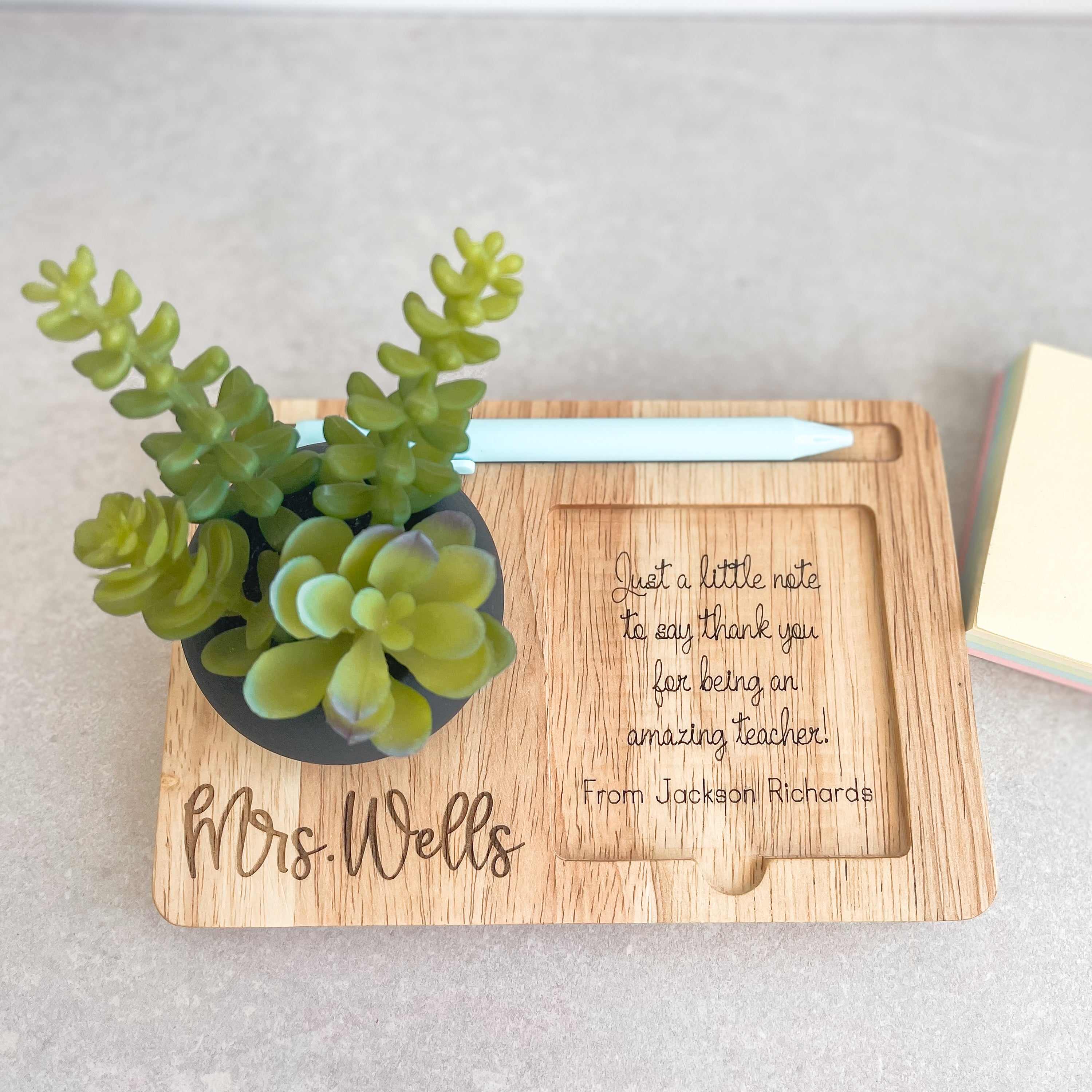 🎁Show your appreciation for your teachers with this beautifully crafted Personalised desk organizer. This wooden tray comes with a faux succulent in a rustic mini pot, a pen holder and a space for sticky note.